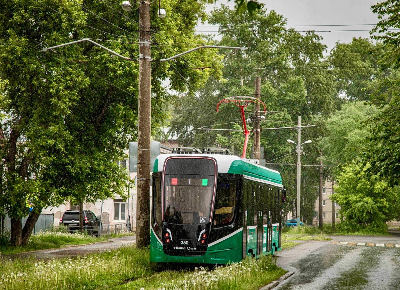 Современные трамвайные вагоны произведены на Усть-Катавском вагоностроительном заводе. Их главная особенность — низкий пол. Полная вместимость вагона составляет 170 человек, сидячих мест — 32.