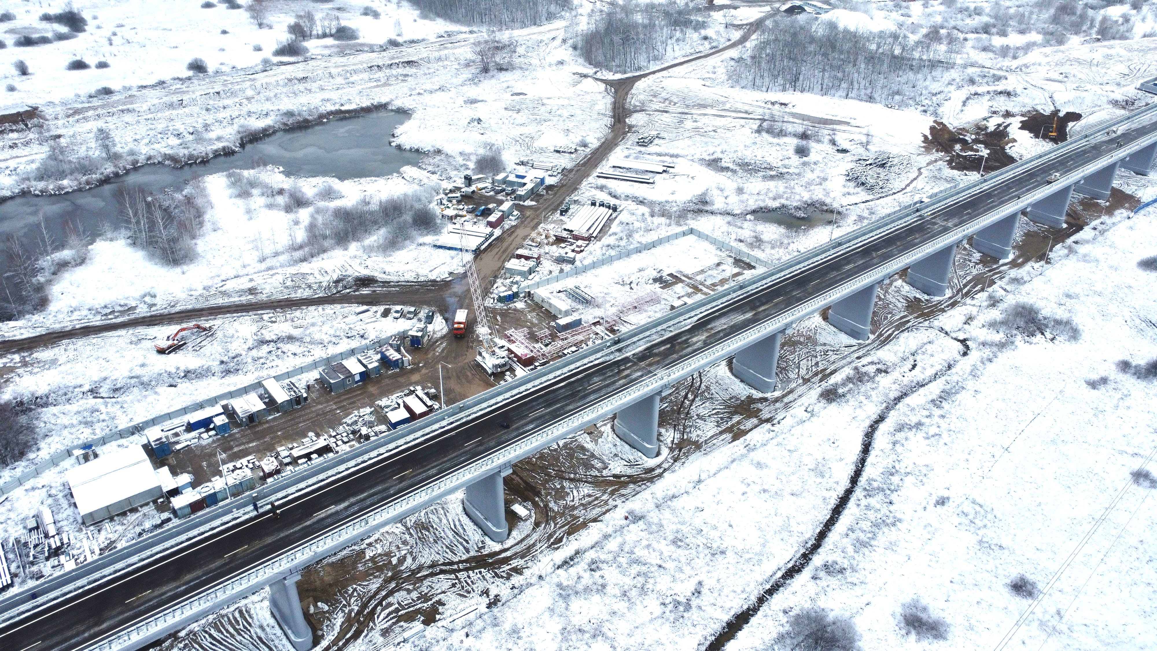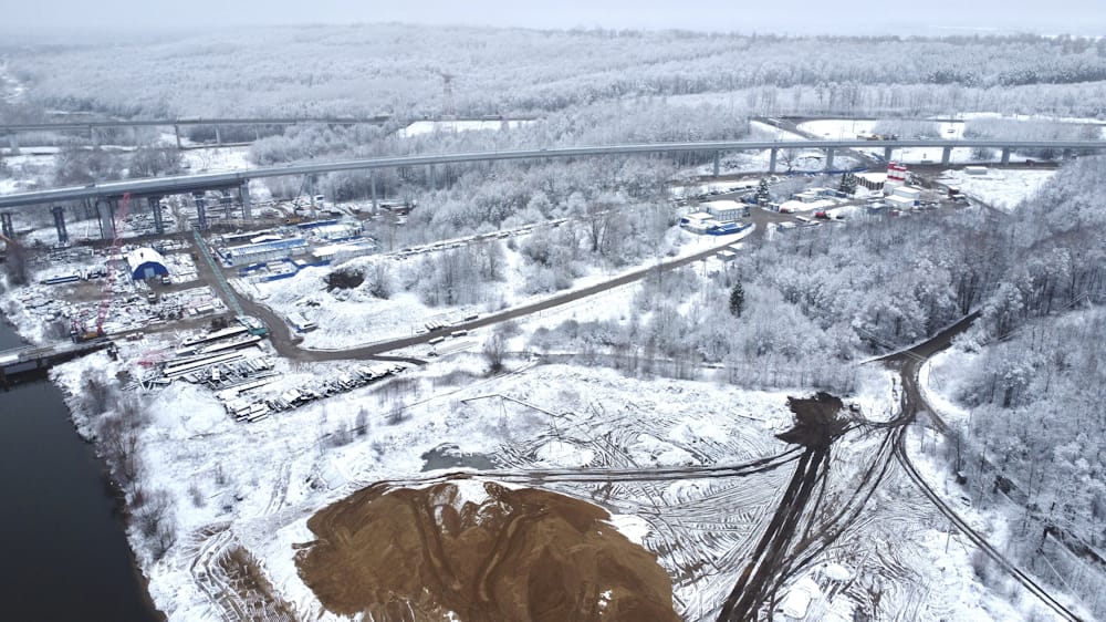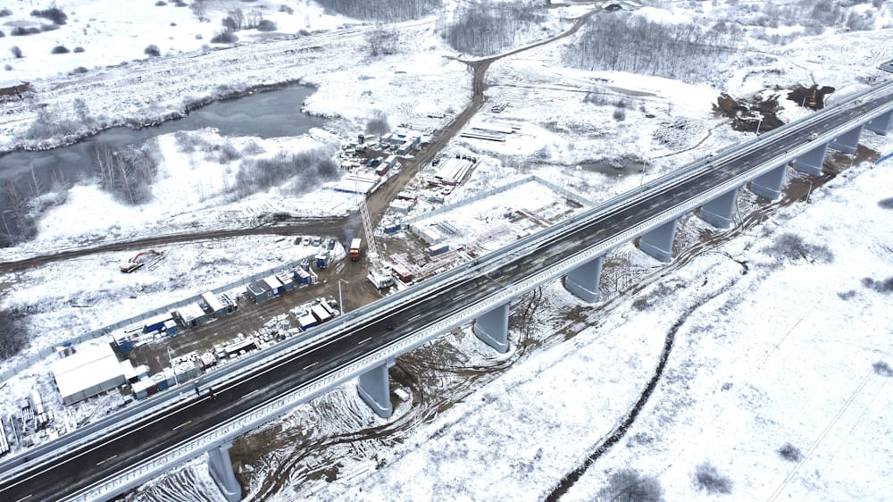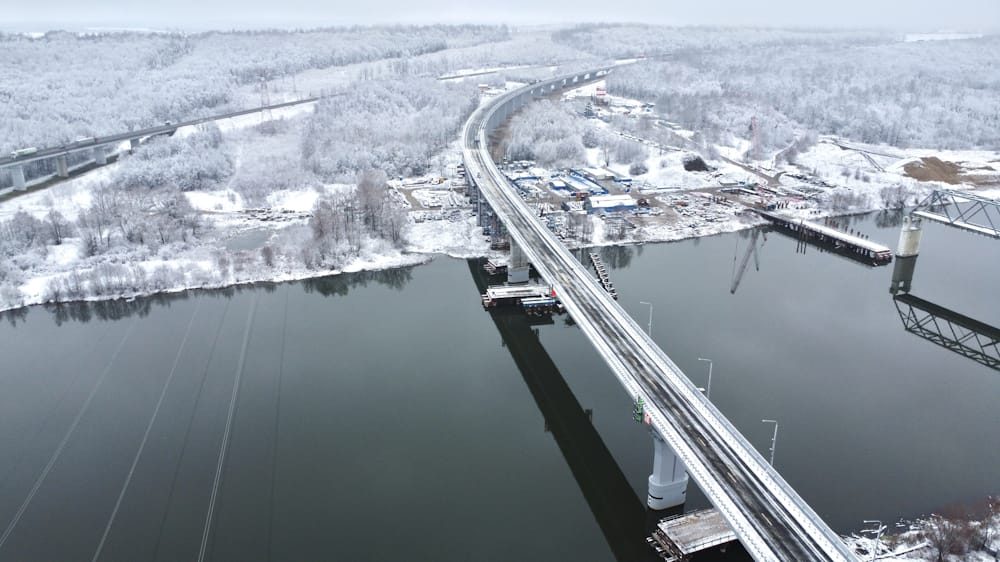 В рамках строительства мостового перехода специалисты возвели 65 опор, в том числе 6 русловых. Пролетное строение на русловой части выполнено из металла весом 3459 тонн, на эстакадных частях – из сборного железобетона. Покрытие на мостовом переходе двухслойное. Для пролетного строения мостового перехода протяженностью 2416 м специалисты уложили более 10 тыс. тонн асфальтобетона.