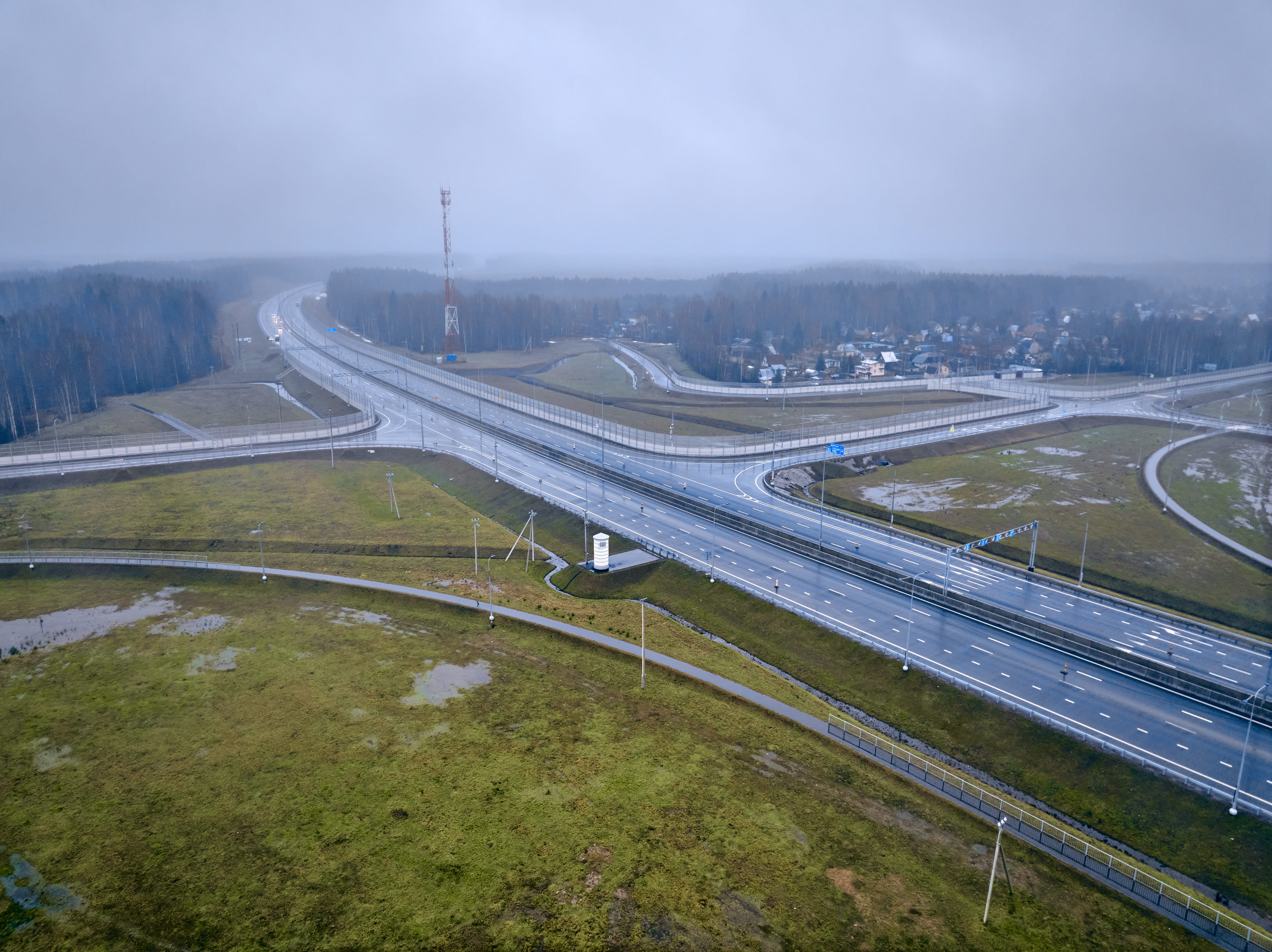 Кроме того, для освещения в темное время суток установлено 8 км линий электроосвещения, а для обеспечения безопасности движения в зимнее время специалисты устроили насосные станции автоматического антигололедного комплекса. Такие комплексы имеют специальные датчики, которые фиксируют состояние дорожного покрытия и определяют толщину водяной пленки, концентрацию противогололедного реагента, температуру покрытия и даже степень износа верхнего слоя асфальта. В случае опасности обледенения они заблаговременно дают команду на распределение минимально необходимого количества экологически чистого и эффективного в условиях низких температур противогололедного реагента. Наконец, в рамках экологических мероприятий установлено 4,2 км шумозащитных экранов.